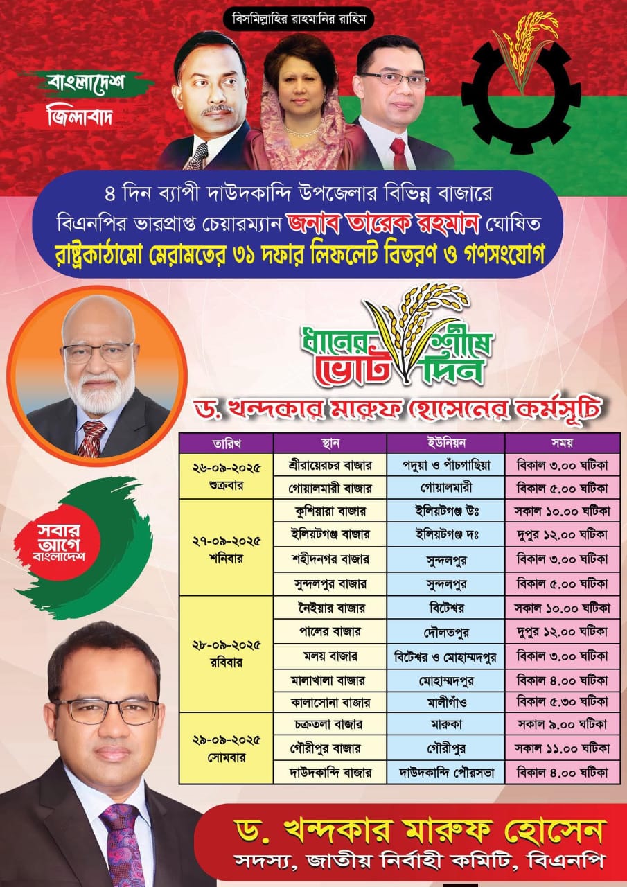 বিএনপির ভারপ্রাপ্ত চেয়ারম্যান তারেক রহমান ঘোষিত ৩১ দফা কর্মসূচি জনগণের মাঝে পৌঁছে দিতে দাউদকান্দি উপজেলা ও পৌর বিএনপি চার দিনব্যাপী ব্যাপক লিফলেট বিতরণ ও গণসংযোগ কর্মসূচি ঘোষণা করেছে। এই কর্মসূচির নেতৃত্ব দেবেন বিএনপির জাতীয় নির্বাহী কমিটির সদস্য, সুপ্রিম কোর্টের আইনজীবী ড. খন্দকার মারুফ হোসেন।
